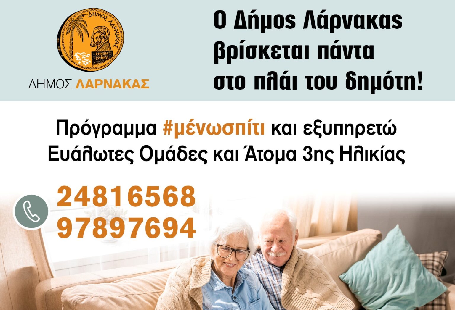 Ο Δήμος Λάρνακας ανακοινώνει ότι από αύριο, Πέμπτη 19 Μαρτίου 2020, θα λειτουργήσει το πρόγραμμα #μένωσπίτι και εξυπηρετώ Ευάλωτες Ομάδες και Άτομα 3ης Ηλικίας.