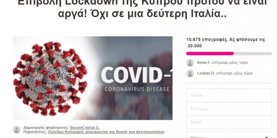 Πάνω από 10,000 υπογραφές μάζεψε σε ελάχιστο χρόνο ηλεκτρονικό ψήφισμα πολιτών στην Κύπρο που καλεί για επιβολή «lockdown» στην χώρα πριν να γίνουμε «δεύτερη Ιταλία».