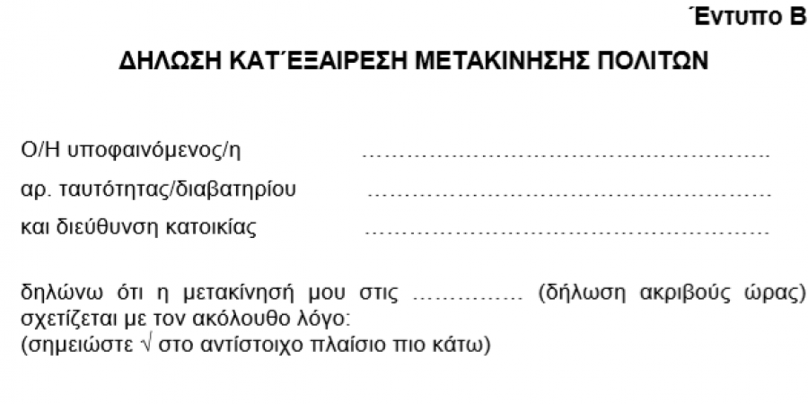 - Για όλες τις άλλες μετακινήσεις, η βεβαίωση μετακίνησης αφορά κάθε μεμονωμένη κίνηση και μόνο αυτή (Έντυπο Β), υπογράφεται από τον ίδιο τον ενδιαφερόμενο με προσωπική του ευθύνη και περιέχει το ονοματεπώνυμο, την ημερομηνία γέννησης, τον αρ. ταυτότητας ή διαβατηρίου, την διεύθυνση κατοικίας, την ώρα μετακίνησης του πολίτη, καθώς και τον συγκεκριμένο σκοπό της μετακίνησης.
