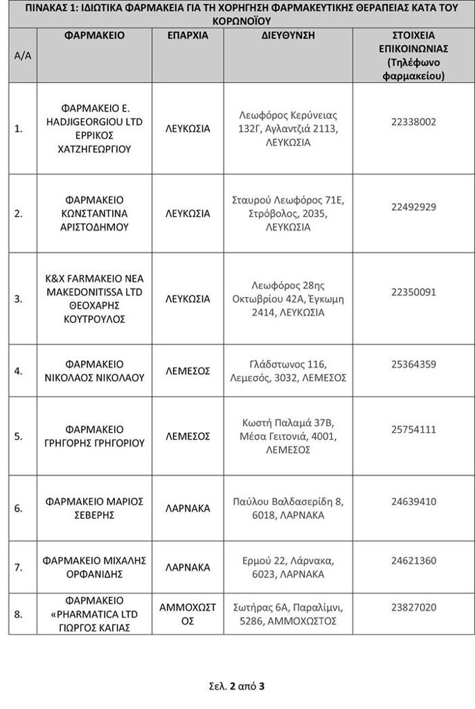 Όσοι ασθενείς έχουν συνταγή για φαρμακευτική αγωγή για αντιμετώπιση λοίμωξης από τον κορωνοϊό COVID-19, την οποία συνταγογράφησε ο Προσωπικός τους Ιατρός μέσω του Συστήματος Πληροφορικής, καλούνται όπως επικοινωνούν τηλεφωνικώς με ένα από τα φαρμακεία που φαίνονται στον πίνακα «ΦΑΡΜΑΚΕΙΑ ΓΙΑ ΤΗ ΧΟΡΗΓΗΣΗ ΦΑΡΜΑΚΕΥΤΙΚΗΣ ΘΕΡΑΠΕΙΑΣ ΚΑΤΑ ΤΟΥ ΚΟΡΩΝΟΪΟΥ». Αρχικά οι συνταγές θα εκτελούνται μόνο από τα συγκεκριμένα δώδεκα (12) ιδιωτικά φαρμακεία. Θα υπάρχει συνεχής ενημέρωση σε περίπτωση διαφοροποίησης των φαρμακείων.