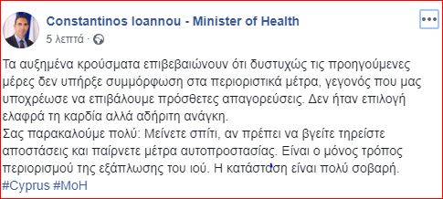Uncategorized Δραματική έκκληση Υπουργού Υγείας: Η κατάσταση είναι πολύ σοβαρή, μείνετε σπίτι Τελευταία ενημέρωση: 25 Μαΐου, 2025 2:46 μμ Από Alexandros Elia 0 Λεπτά Ανάγνωσης Κοινοποίηση ΚΟΙΝΟΠΟΙΗΣΗ Advertisements Δραματική έκκληση του Υπουργού Υγείας μετά την ανακοίνωση των νέων κρουσμάτων. Δείτε αυτούσια την ανάρτηση του στο facebook estset test Κοινοποιήστε αυτό το άρθρο Facebook Email Copy Link Print Τρεις πτήσεις φτάνουν στο αεροδρόμιο Λάρνακας από το Λονδίνο Επίσημο: Στον πάγκο της Νέας Σαλαμίνας ο Πάμπος Χριστοδούλου Νέα χρονοδιαγράμματα στο ΓεΣΥ «Καθαρά Δευτέρα… Καθαρά κάθε μέρα» και φέτος από το Κίνημα Οικολόγων – Συνεργασία Πολιτών Γιώργος Σαμπάνης: Έρχεται στη Λάρνακα