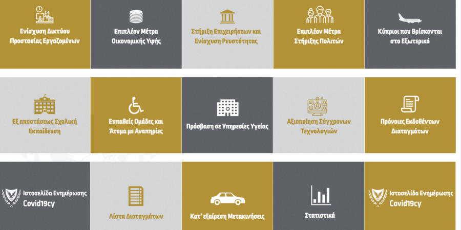 Επιπρόσθετα, στην ιστοσελίδα www.covid19.cy υπάρχει πληροφόρηση για πρόσβαση στις Υπηρεσίες Υγείας, καθώς και για θέματα που αφορούν τους Κύπριους που βρίσκονται στο εξωτερικό, και για άλλα μέτρα στήριξης των πολιτών.