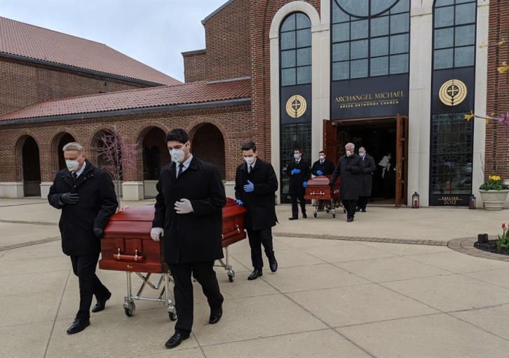 Στους μόνους που επιτράπηκε η είσοδος στο ναό ήταν τα παιδιά και τα εγγόνια των αποθανόντων, ενώ οι υπόλοιποι που παρέστησαν στην κηδεία περιορίστηκαν στον προαύλιο χώρο της εκκλησίας, φορώντας γάντια και προστατευτικά γάντια.