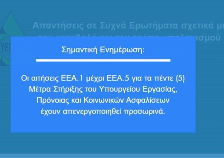 Σημαντική Ενημέρωση: Οι αιτήσεις ΕΕΑ.1 μέχρι ΕΕΑ.5 για τα πέντε (5) Μέτρα Στήριξης του Υπουργείου Εργασίας, Πρόνοιας και Κοινωνικών Ασφαλίσεων έχουν απενεργοποιηθεί προσωρινά.