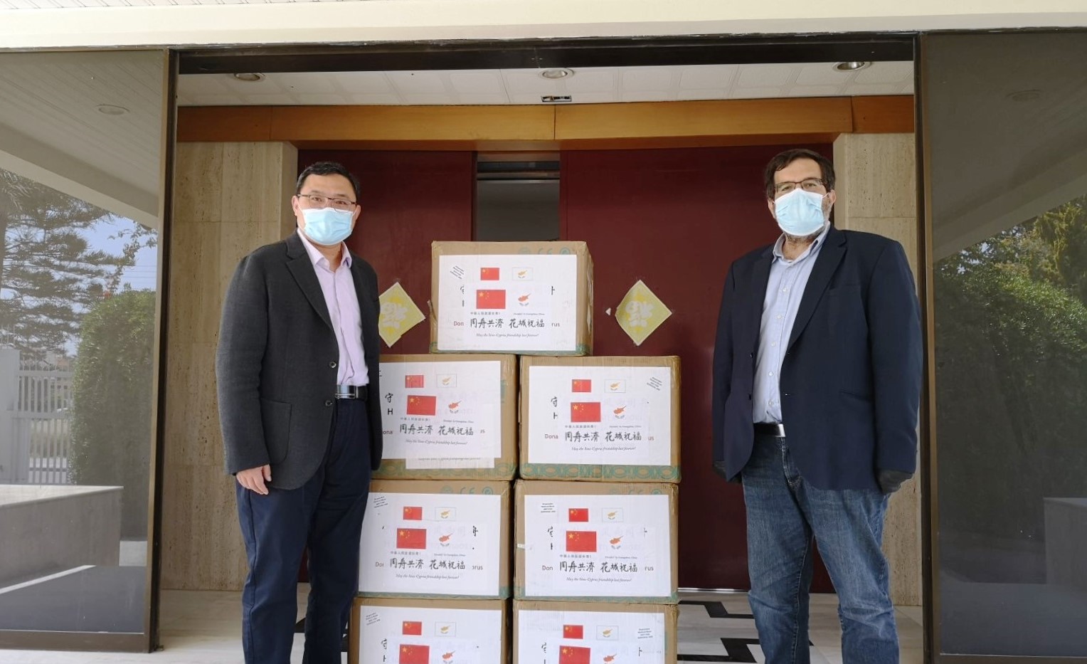 Εκ μέρους της Πρεσβείας την παράδοση των μασκών έκανα ο Πολιτικός Σύμβουλος κ.Wang Sheng και εκ μέρους του Δήμου Λάρνακας τις παρέλαβε ο Αν. Δημοτικός Γραμματέας κ. Ανδρέας Λουκά.
