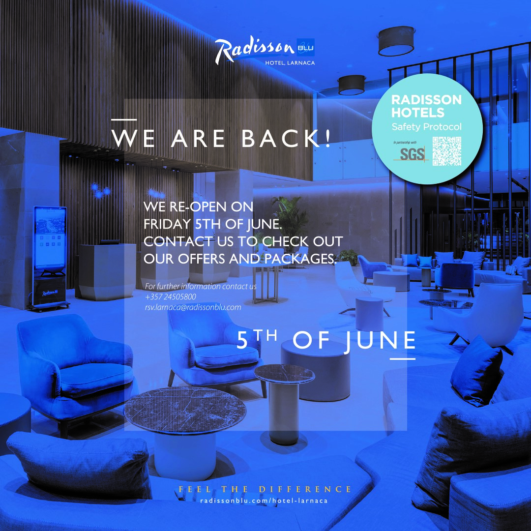 Η διεύθυνση του Radisson Blu Hotel, Larnaca είναι στην ευχάριστη θέση να ανακοινώσει ότι το ξενοδοχείο θα επαναρχίσει τη λειτουργία του την Παρασκευή 5 Ιουνίου, 2020.