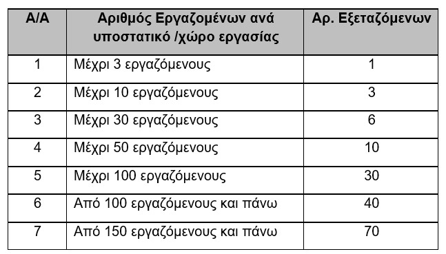 Ο έλεγχος θα διενεργηθεί σε παγκύπρια βάση, θα είναι δειγματοληπτικός και δεν θα αφορά στο σύνολο των ατόμων που εργάζονται στις εν λόγω επιχειρήσεις. Στον πιο κάτω πίνακα παρουσιάζεται ο αριθμός των εξεταζόμενων ατόμων ανά αριθμό εργαζομένων ανά υποστατικό: