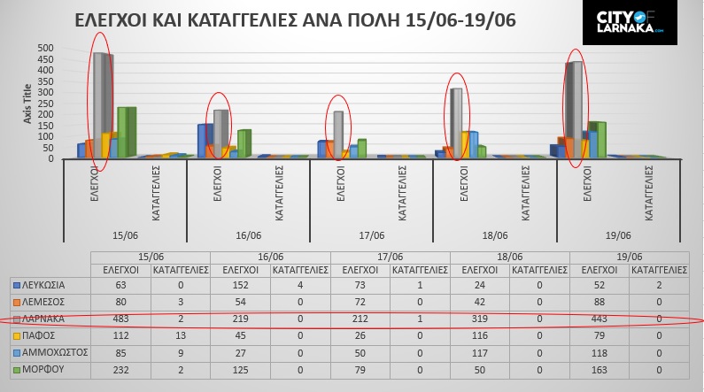 Να τονίσουμε ότι  η πόλη μας από το τριήμερο του Κατακλυσμού και μετά αποτελεί πόλο έλξης για την αστυνομία καθώς σύμφωνα με τις επίσημε ανακοινώσεις της αστυνομίας έχει δεχθεί με διαφορά τους περισσότερους έλέγχους απ΄οποιαδήποτε άλλη επαρχία έχοντας παράλληλα τις λιγότερες καταγγελίες. Η σελίδα μας παρουσίασε στοιχεία μεταξύ 15/06/-19/06 όπου στη Λάρνακα διενεργήθηκε το 44% των ελέγχων σε παγκύπρια βάση. Άξιον απορίας έιναι ότι η Λεμεσός σε αυτό το τετραήμερο δέχθηκε τους λιγότερους ελέγχους απ’ όλες τις πόλεις, ακόμη και από τη Λευκωσία που δεν είναι παραλιακή πόλη.