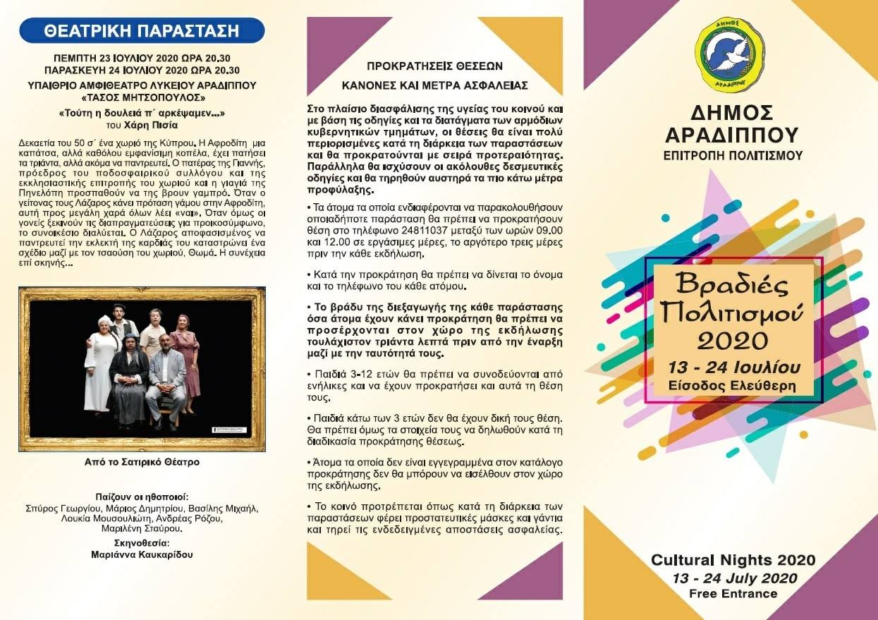 Οι Βραδιές Πολιτισμού θα ολοκληρωθούν με δύο παραστάσεις του θεατρικού έργου «Τούτη η δουλειά π΄ αρκέψαμεν», από το Σατιρικό Θέατρο, σε σκηνοθεσία Μαριάννας Καυκαρίδου, την Πέμπτη 23 Ιουλίου και Παρασκευή 24 Ιουλίου.