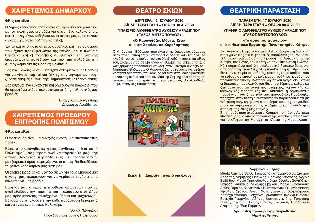 Οι θεατρικές παραστάσεις θα πραγματοποιηθούν στο υπαίθριο αμφιθέατρο του Λυκείου Αραδίππου «Τάσος Μητσόπουλος».
