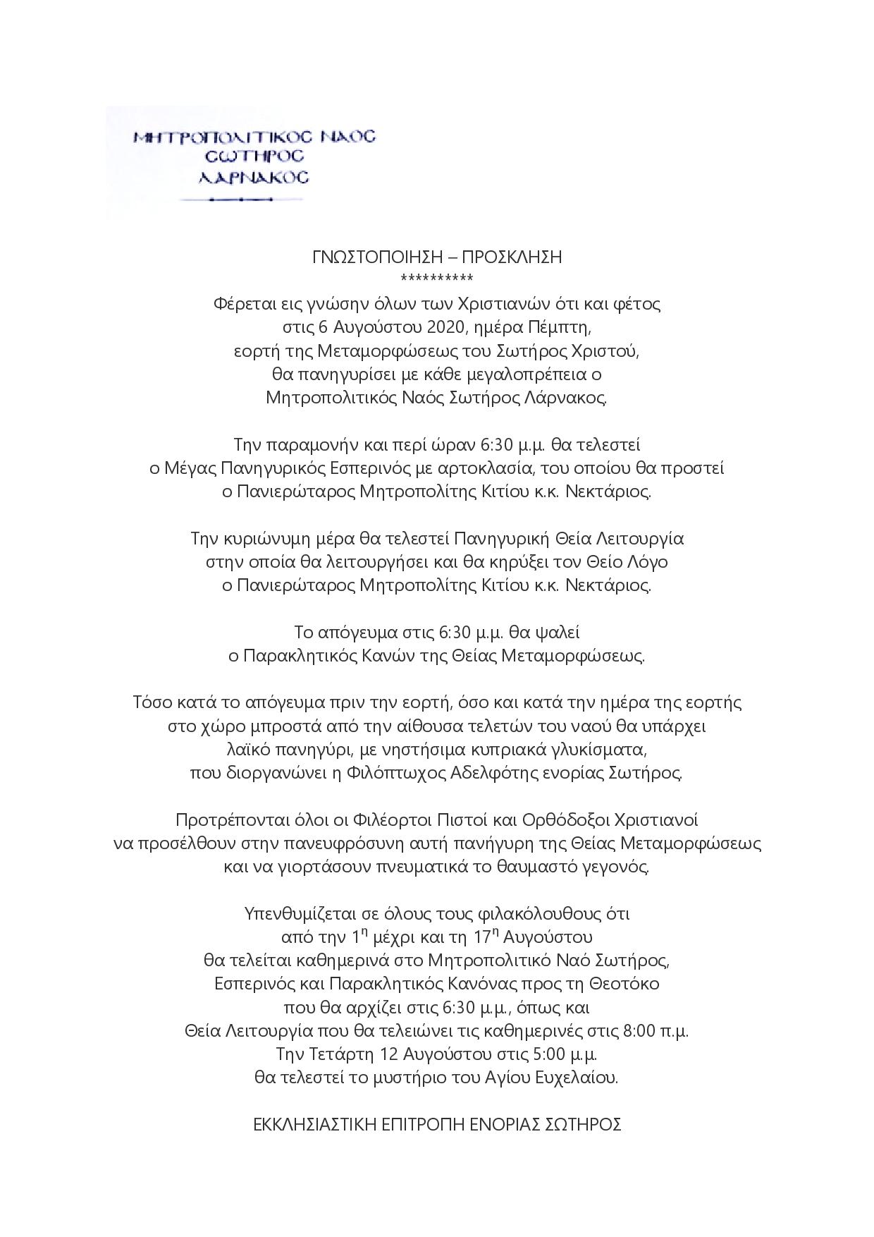 Γενικά Ανακοίνωση- Πρόσκληση του Μητροπολιτικού Ναού Σωτήρος στη Λάρνακα Τελευταία ενημέρωση: 25 Μαΐου, 2025 4:31 μμ Από Alexandros Elia 0 Λεπτά Ανάγνωσης Κοινοποίηση ΚΟΙΝΟΠΟΙΗΣΗ Advertisements Ο Μητροπολιτικός Ναός Μεταμορφώσεως του Σωτήρος, Λάρνακα, ανακοινώνει στο πίμνιο του, ότι και φέτος η εορτή της Μεταμορφώσεως του Σωτήρος, θα πανηγυρίσει με κάθε μεγαλοπρέπεια, ο Μητροπολιτικός Ναός του Σωτήρος στη Λάρνακα. estset test Κοινοποιήστε αυτό το άρθρο Facebook Email Copy Link Print Τελετή Βραβεύσεων Altius Insurance Επιστροφή στα θρανία και φέτος στη Lidl Cypus Συζήτηση με θέμα η Λάρνακα του σήμερα και του αύριο με την παρουσία του κ. Ανδρέα Βύρα ΒΙΝΤΕΟ: Ξανά στην κυκλοφορία ο κυκλικός κόμβος Καλού Χωριού Βρέθηκαν επικίνδυνα παιχνίδια στην αγορά (pics)