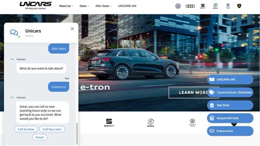 Η Unicars παρουσιάζει μια νέα εφαρμογή chat στην ιστοσελίδα της για καλύτερη και πιο αποτελεσματική πλοήγηση. Μέσω της νέας αυτής εφαρμογής, η Unicars ενισχύει την ψηφιακή της παρουσία, επιδιώκοντας να εμπλουτίσει την εμπειρία των καταναλωτών της. Στόχος είναι οι καταναλωτές να μπορούν να παίρνουν απαντήσεις στα ερωτήματά τους το συντομότερο δυνατό. Η εφαρμογή chat είναι εύκολη στη χρήση αλλά και ένας εξαιρετικός τρόπος να βρεις γρήγορα και άμεσα πληροφορίες.