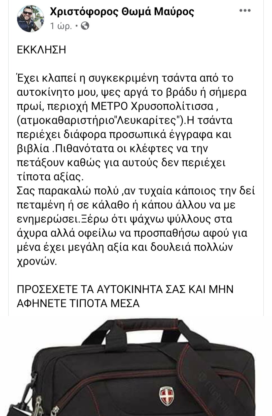 Έκκληση μέσα από το λογαριασμό του στα Μέσα Κοινωνικής Δικτύωσης κάνει Συμπολίτης μας που του έχει κλαπεί η τσάντα από το αυτοκίνητο του :