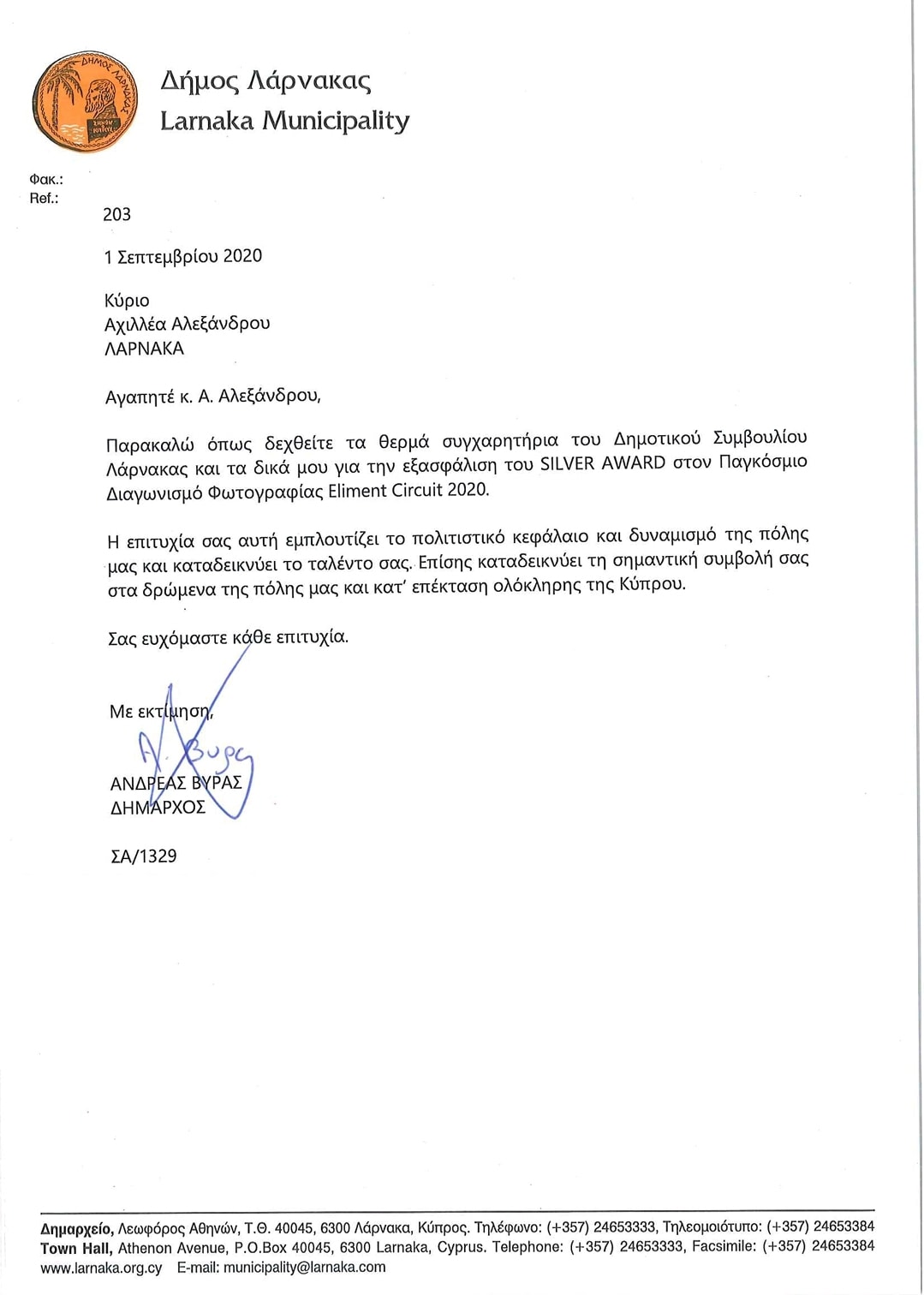 Ο Δήμος Λάρνακας εκφράζει τα θερμά συγχαρητήρια στον συνδημότη μας Αχιλλέα Αλεξάνδρου, για την εξασφάλιση του SILVER AWARD στον Παγκόσμιο Διαγωνισμό Φωτογραφίας Eliment Circuit 2020.