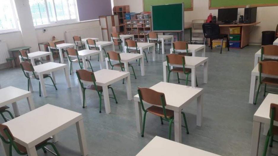 Σε άλλο σχολείο, πλακάτ τοποθετήθηκαν πρόχειρα μεταξύ των θρανίων προκειμένου να τηρούνται οι αποστάσεις.