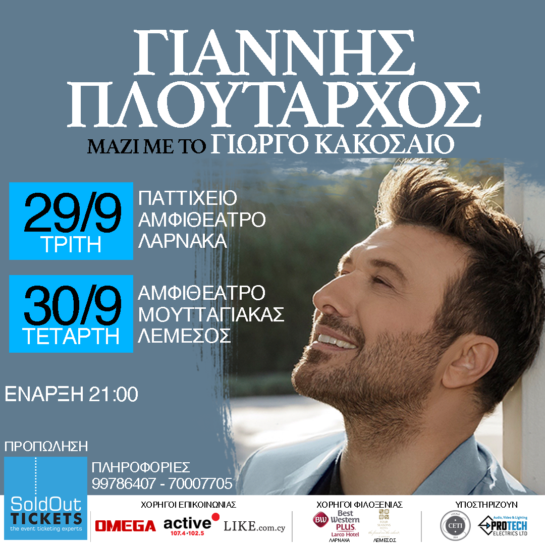 Ο καλλιτέχνης της αγάπης, των συναισθημάτων και των αναμνήσεων, ο Γιάννης Πλούταρχος, έρχεται στη Κύπρο για δύο μοναδικές εμφανίσεις την Τρίτη 29 Σεπτεμβρίου στο Παττίχειο Δημοτικό Αμφιθέατρο Λάρνακας και την Τετάρτη 30 Σεπτεμβρίου στο Κοινοτικό Αμφιθέατρο Μουτταγιάκας στη Λεμεσό.