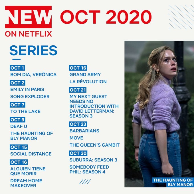 Το Netflix, πιστό στο ραντεβού του, ανακοίνωσε όλες τις νέες σειρές για τον Οκτώβριο που θα μας καθηλώσουν. Με ανάρτηση στον επίσημο λογαριασμό του στο Twitter, το Netflix ενημερώνει τα εκατομμύρια των συνδρομητών του για τις νέες σειρές που θα προστεθούν στην ψηφιακή πλατφόρμα μέσα στον Οκτώβριο.
