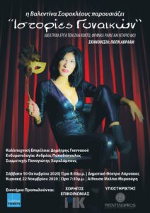 Το Σάββατο 10 Οκτωβρίου 2020 και ώρα 8:30 μ.μ. στο Δημοτικό Θέατρο Γιώργος Λυκούργος, έχουμε την θεατρική παράσταση «Ιστορίες Γυναικών» βασισμένες σε θεατρικά κείμενα των Jean Cocteau και Dario Fo. Σκηνοθεσία: Πόπη Αβραάμ. Είσοδος €12 & €10 (για μαθητές, φοιτητές, συνταξιούχους).