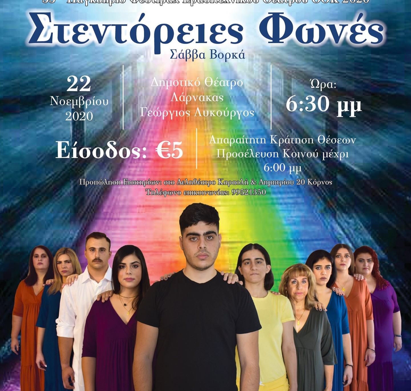 Την Κυριακή 22 Νοεμβρίου 2020 και ώρα  6:30 μ.μ., στο Δημοτικό Θέατρο Γιώργος Λυκούργος στη Λάρνακα η Θεατρική Ομάδα ΔΕΛΗΘΕΑΤΡΟ, παρουσιάζει την θεατρική παράσταση «Στεντόρειες Φωνές» του Σάββα Βορκά.
