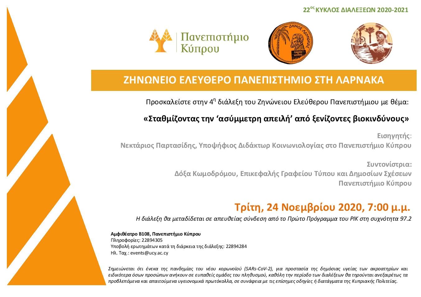 Υπενθυμίζεται ότι οι Διαλέξεις στη Στέγη Γραμμάτων και Τεχνών Λάρνακας αναβάλλονται μέχρι και τις 30 Νοεμβρίου 2020 αλλά η 4η Διάλεξη θα μεταδίδεται σε απευθείας σύνδεση από το Πρώτο Πρόγραμμα του ΡΙΚ στη συχνότητα 97.2