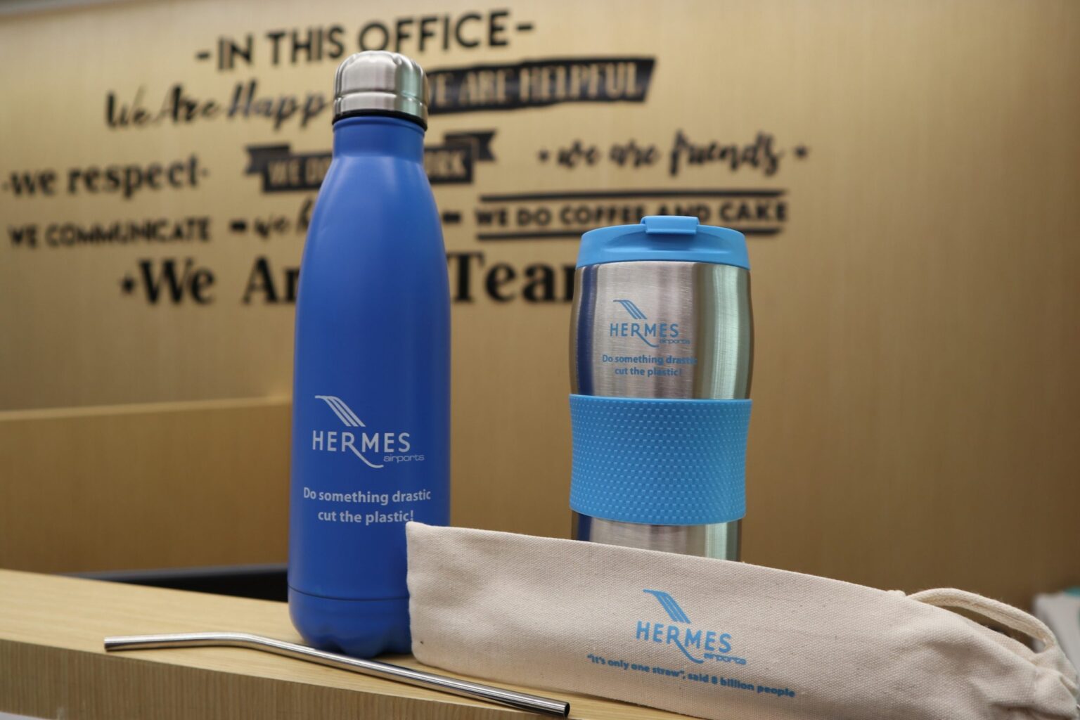 Αποδεικνύοντας για άλλη μια φορά την κοινωνική της υπευθυνότητα, η Hermes Airports συνεχίζει να εστιάζει στην στρατηγική της που αφορά τη μείωση του αποτυπώματος της λειτουργίας των αεροδρομίων της Κύπρου στο περιβάλλον.  Γι’ αυτό, το προσωπικό της διαχειρίστριας εταιρίας των δυο αεροδρομίων έλαβε ένα χρήσιμο, χρηστικό και προπαντός οικολογικό πακέτο-δώρο. Ανάμεσα σε άλλα, το πακέτο περιλάμβανε μια πάνινη τσάντα, ένα επαναχρησιμοποιήσιμο θέρμο, ένα επαναχρησιμοποιήσιμο μπουκάλι και δύο μεταλλικά καλαμάκια, σε μια προσπάθεια να ελαχιστοποιηθεί η χρησιμοποίηση πλαστικών μιας χρήσης από το προσωπικό.
