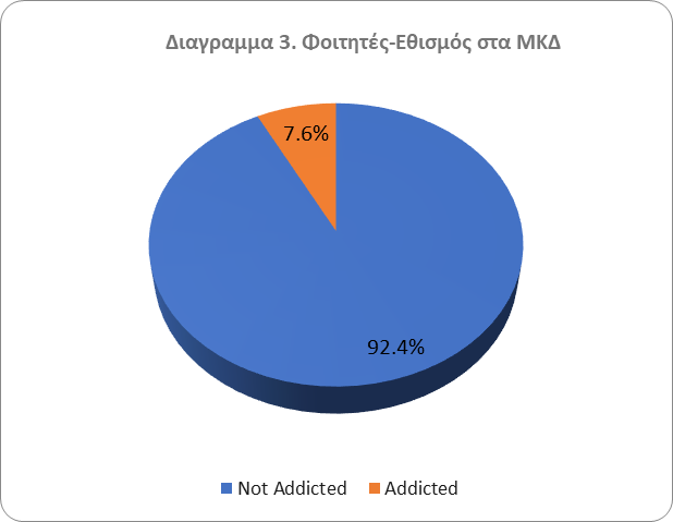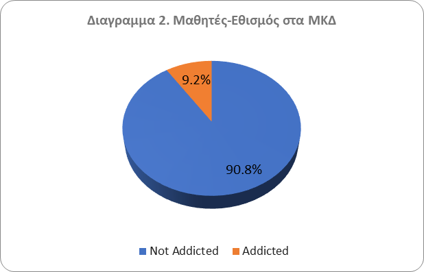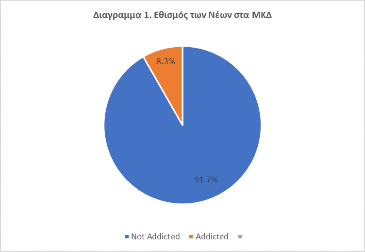 Σύμφωνα με τα ευρήματα, το 8.3% των νέων του δείγματος αντιμετωπίζει συμπτώματα εθισμού στα ΜΚΔ και ταξινομούνται ως εξαρτημένα άτομα. Μικρές αν και υπαρκτές είναι οι διαφορές στο δείγμα μεταξύ μαθητών (9.2%) και φοιτητών (7.6%) όσον αφορά στον εθισμό.