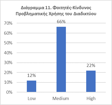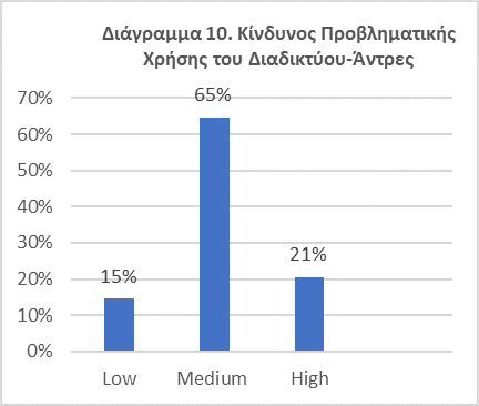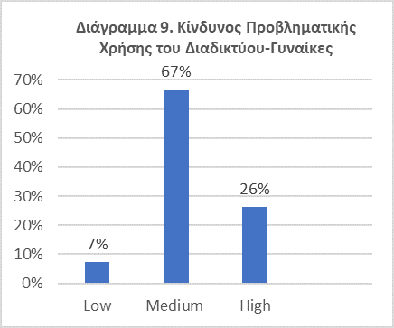 Στην κατηγορία υψηλού κινδύνου προβληματικής χρήσης του Διαδικτύου εντάσσονται 26% των γυναικών και 21% των αντρών του συνόλου των νέων.