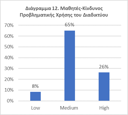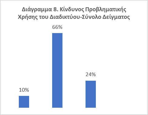 Ένα σημαντικό εύρημα της παρούσας μελέτης είναι ότι περίπου το ένα τέταρτο (24%) των 1059 έγκυρα συμμετεχόντων νέων είχαν βαθμολογίες που υποδηλώνουν γενικευμένη προβληματική χρήση του διαδικτύου (ΠΧΔ). Το 66% του δείγματος αντιμετωπίζει μέτριο κίνδυνο Προβληματικής Χρήσης του Διαδικτύου ενώ το 10% χαμηλό κίνδυνο.