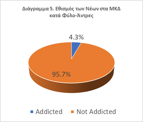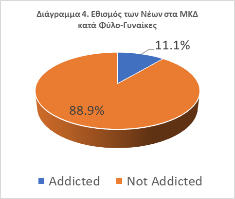 Αξιοσημείωτο είναι ότι παρατηρούνται ενδιαφέρουσες διαφοροποιήσεις όσο αφορά στα δύο φύλα με κυρίαρχο εύρημα το υπερδιπλάσιο ποσοστό γυναικών (11.1%) σε σχέση με τους άντρες (4.3%) που μπορεί να διαγνωστεί με εθισμό στα Μέσα Κοινωνικής Δικτύωσης
