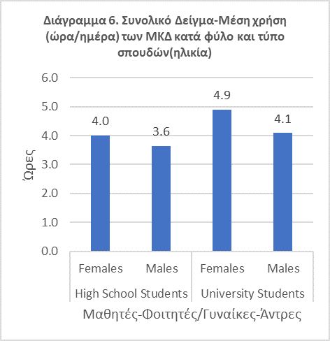 Ο μέσος χρόνος χρήσης των ΜΚΔ ανά ημέρα ανέρχεται στις 4.3 ώρες (SD 3.4), με το γυναικείο φύλο (4.5) και ειδικά τις φοιτήτριες (4.9) να ξεπερνά κάπως τον μέσο χρόνο χρήσης των ΜΚΔ. Σύμφωνα με άλλες στατιστικές (Statista, 2018) οι Φιλιππίνες καταλάμβαναν την πρώτη θέση στον χρόνο χρήσης των ΜΚΔ με πάνω από 4 ώρες ανά άτομο κατά μέσο όρο ενώ γενικά η τάση που παρατηρείται στον νεανικό πληθυσμό στην Κύπρο ξεπερνά τους διεθνείς μέσους όρους χρήσης των ΜΚΔ[1].