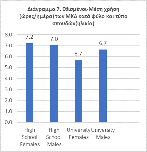 Το δείγμα που ταξινομήθηκε στην κατηγορία προβληματικής χρήσης των ΜΚΔ-εθισμένο, φτάνει τις 45.5 ώρες διάμεσης εβδομαδιαίας χρήσης των ΜΚΔ ή 2,366 ώρες τον χρόνο ή 98,5 ημέρες σύνδεσης κατ’ έτος. Στο σύνολο του νεανικού πληθυσμού του δείγματος μας, ο μέσος εβδομαδιαίος χρόνος χρήσης των ΜΚΔ φτάνει στις 30.1 ώρες γεγονός ανησυχητικό.