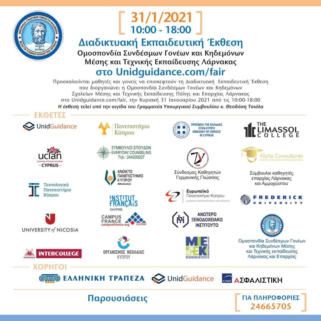 Η Ομοσπονδία Συνδέσμων Γονέων Μέσης και Τεχνικής Εκπαίδευσης Λάρνακας μέσα στα πλαίσια των δραστηριοτήτων της, όπως κάθε χρόνο έτσι και φέτος διοργανώνει τη 13η Ετήσια Εκπαιδευτική Έκθεση που θα πραγματοποιηθεί στις 31 Ιανουαρίου 2021, ημέρα Κυριακή από τις 10:00-18:00 διαδικτυακά στο Unidguidance.com/fair.