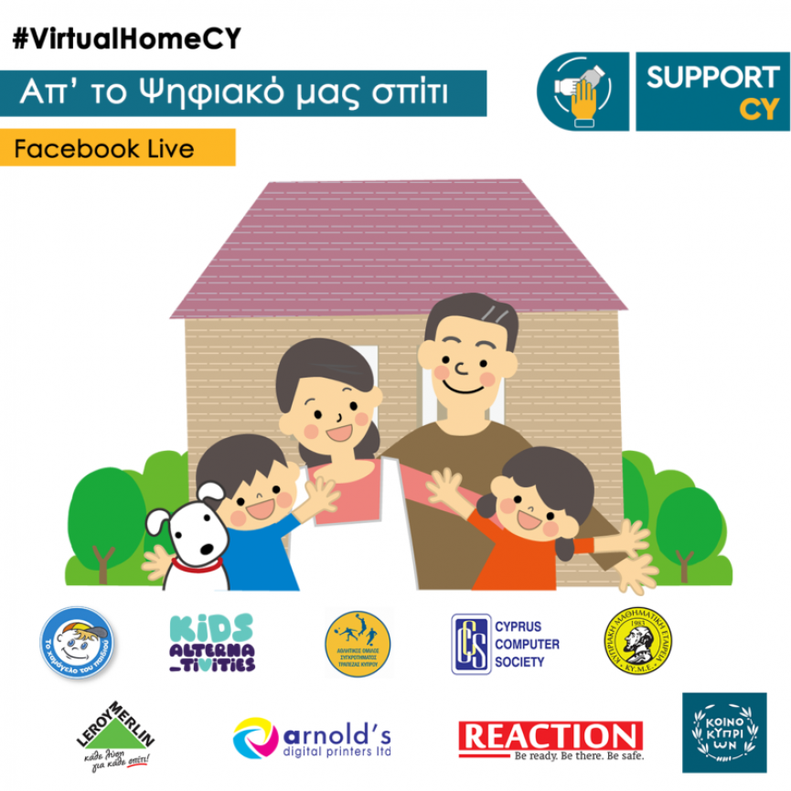 Το #VirtualHomeCY φέρνουν κοντά μας το #SupportCY, η Τράπεζα Κύπρου και ο Οργανισμός Reaction μαζί με τα μέλη του Δικτύου Leroy Merlin, Arnold’s Digital Printers, Το Χαμόγελο του Παιδιού, KIDS Alternativities, Αθλητικός Όμιλος Τράπεζας Κύπρου, Κυπριακός Σύνδεσμος Πληροφορικής και η Κυπριακή Μαθηματική Εταιρεία.