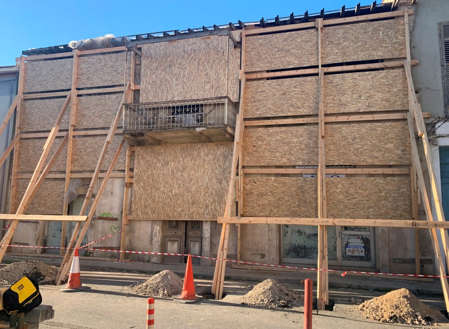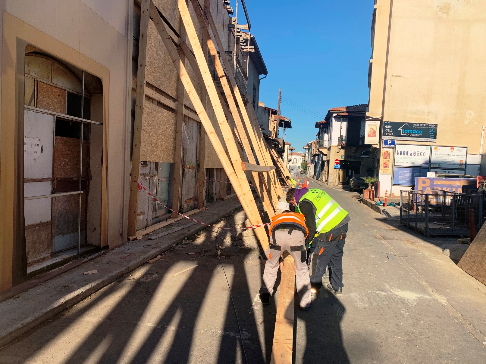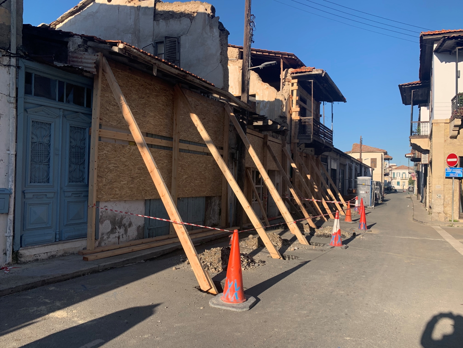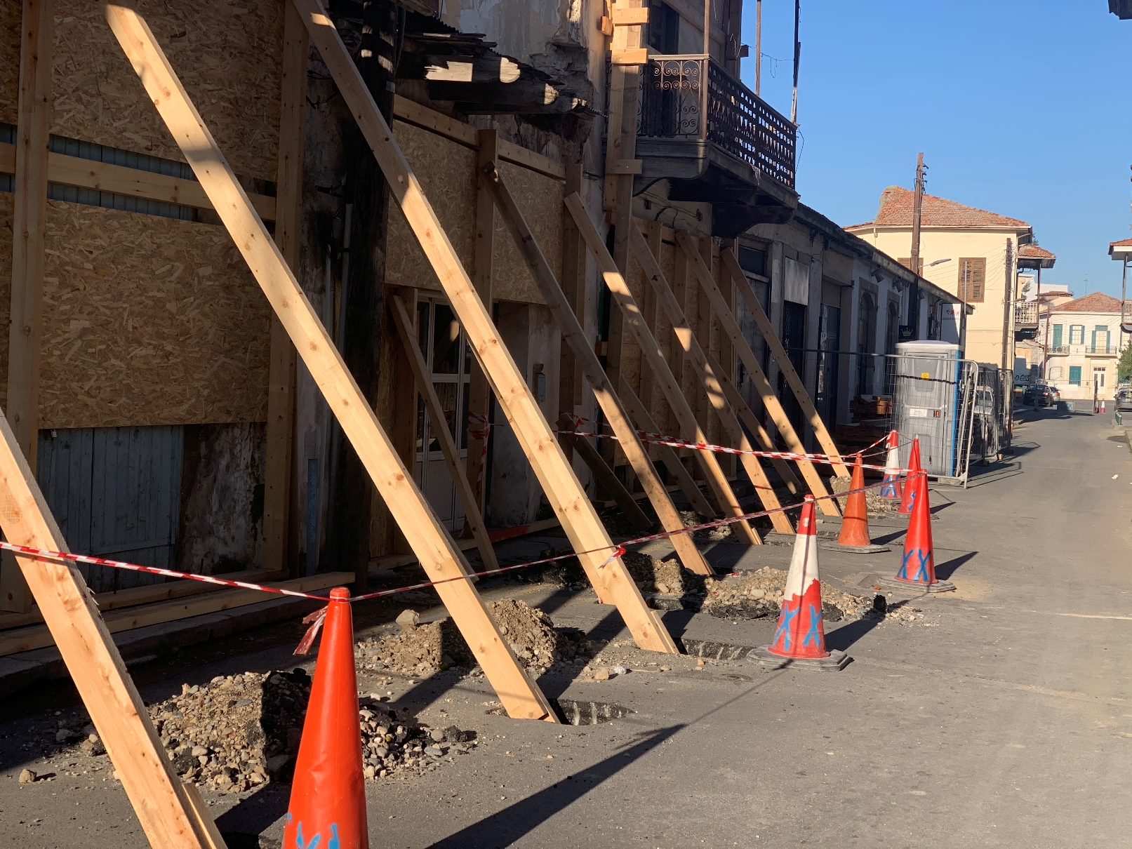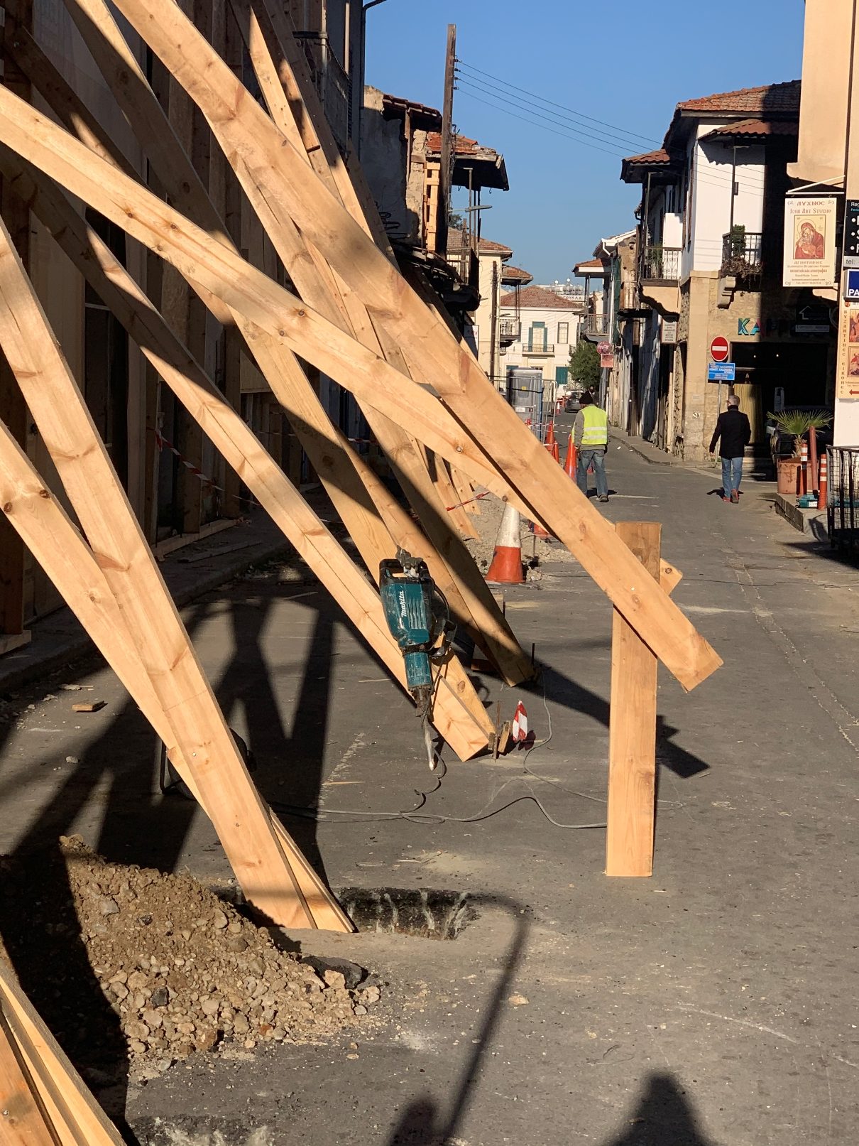 Οι εργασίες στο παρόν στάδιο αφορούν την στήριξη των διατηρητέων σπιτιών που βρίσκονται επί της οδού Αγίου Λαζάρου, με προσωρινή ξύλινη υποδομή ούτως ώστε να είναι ανθεκτικά στους κραδασμούς που θα προκληθούν κατά τη διάρκεια των εργασιών.