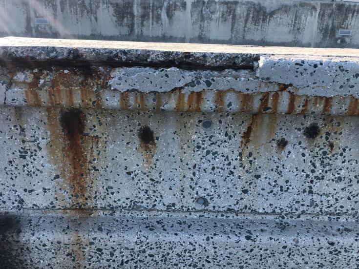 Σε ορισμένα σημεία του μετάλλου των στηθαίων υπάρχει πλήρης οξείδωση, ενώ μικρά τμήματα μπετόν αποκολλήθηκαν με αποτέλεσμα να εντείνουν την ανησυχία του κοινού για την κατάσταση στην οποία περιήλθε τμήμα του έργου έξι μόλις χρόνια μετά την ολοκλήρωση του.