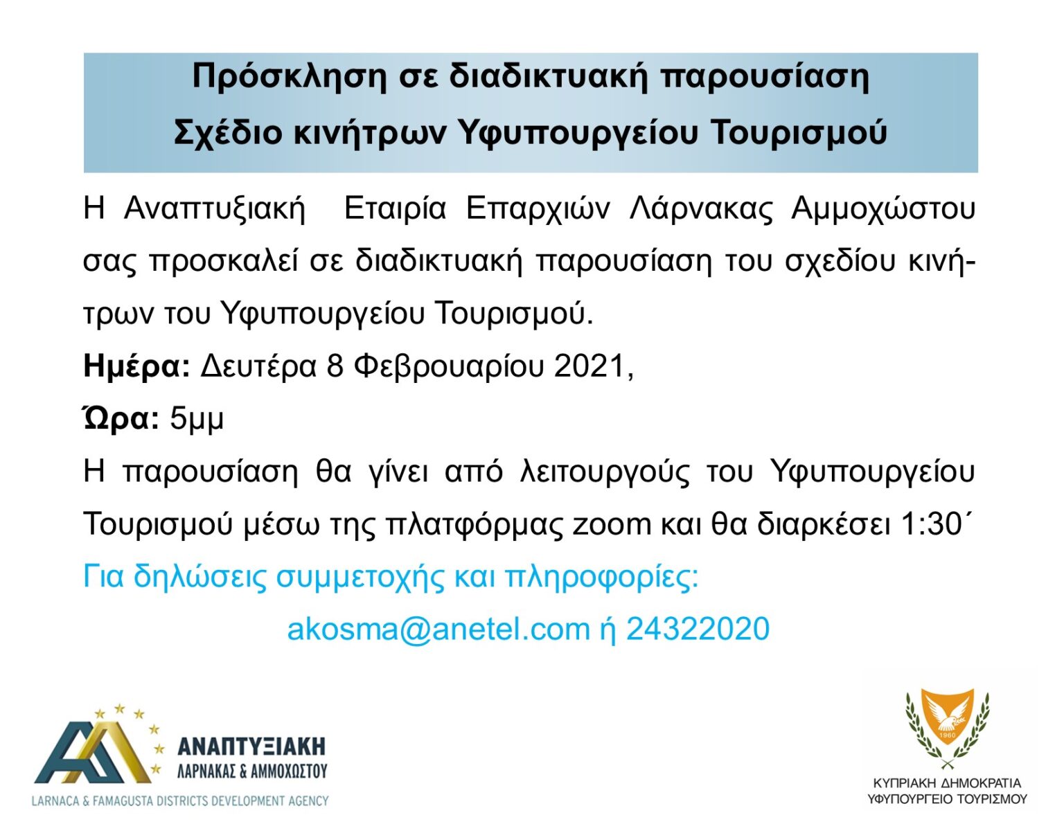 Η Αναπτυξιακή Εταιρεία Επαρχιών Λάρνακας Αμμοχώστου σας προσκαλεί σε διαδικτυακή παρουσίαση του σχεδίου κινήτρων του Υφυπουργείου Τουρισμού, την Δευτέρα 8 Φεβρουαρίου 2021, στις 5μμ μέσω της πλατφόρμας zoom.