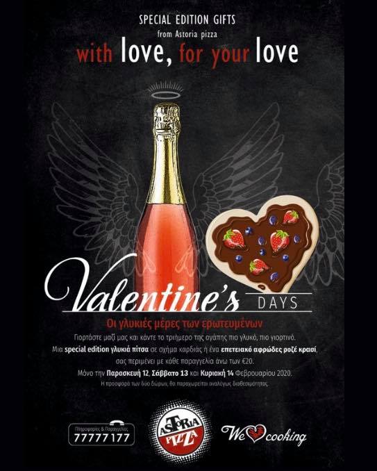 Η πιτσαρία Astoria την μετατρέπει σε ιδανικό γεύμα για την ημέρα των ερωτευμένων Βαλεντίνου, αφού με κάθε παραγγελία άνω των €20 μια special edition γλυκιά πίτσα σε σχήμα καρδιάς ή ένα επετειακό αφρώδες ροζέ κρασί περιμένει να δώσει χρώμα στην πρώτη καραντινογιορτή του Αγίου Βαλεντίνου.