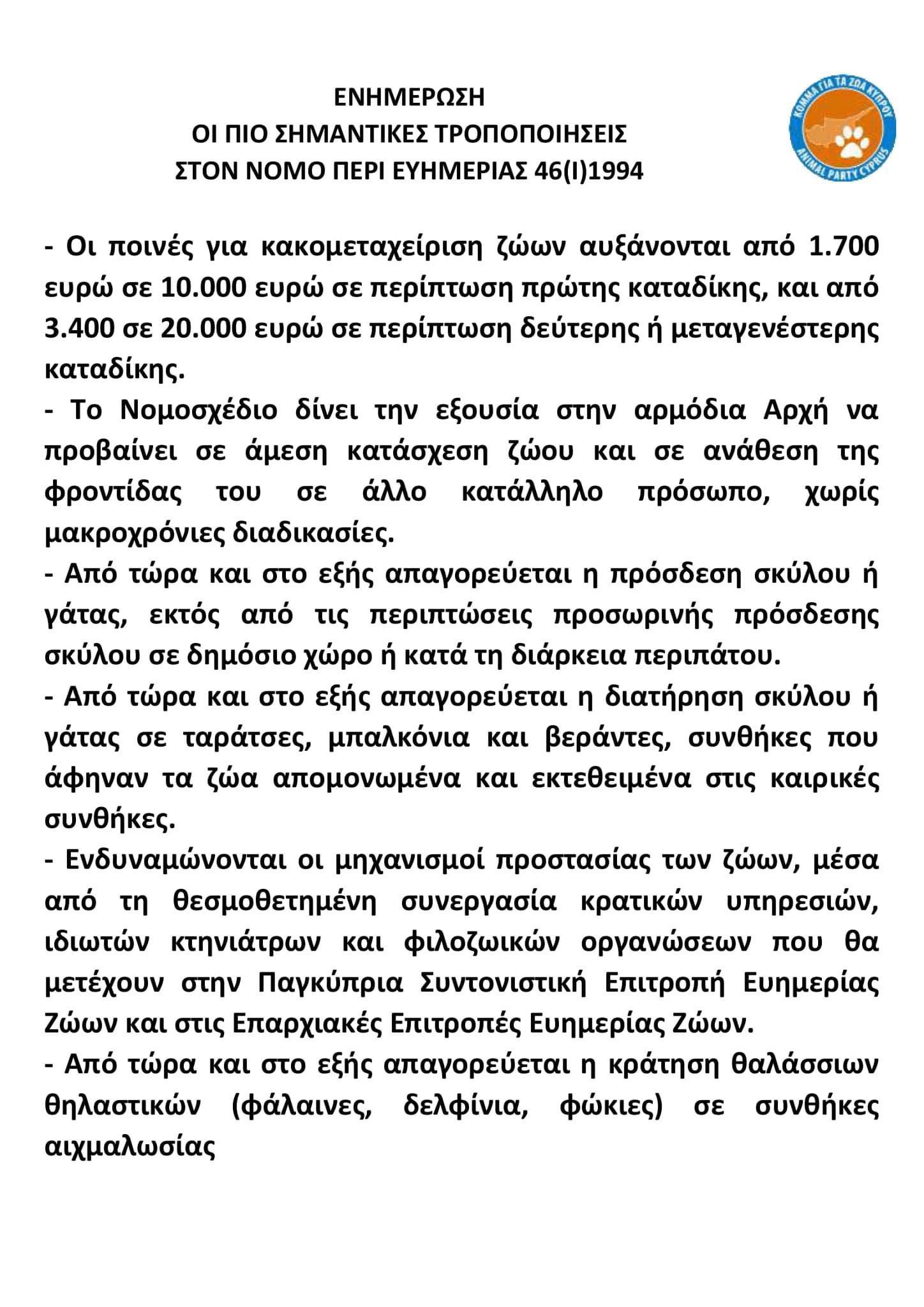 Υπάρχουν και επιμέρους αλλαγές που είναι τεχνικές αλλαγές και αφορούν την λειτουργία των επαρχιακών επιτροπών ευημερίας των ζωών και της παγκύπριας συντονιστικής,δεν θα εκλέγεται ο Πρόεδρος όπως ζητήσαμε από τα μέλη αλλά θα διορίζεται όπως και για το πως και που θα χειρίζονται τα λεφτά, την δράση.