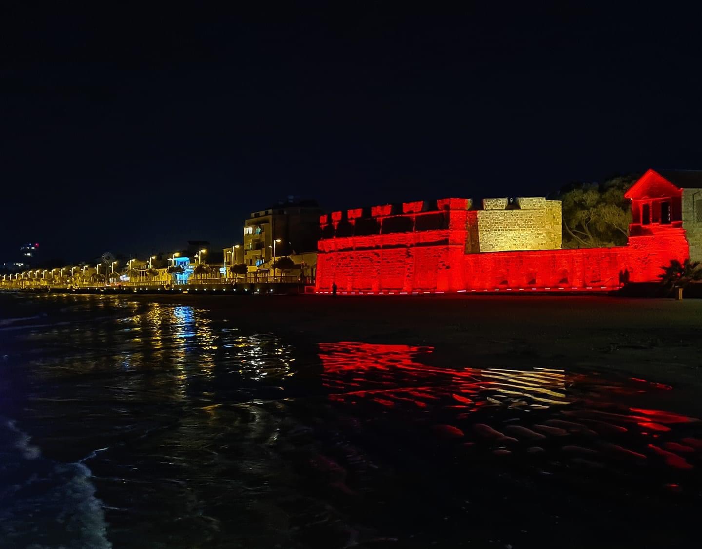 Το Μεσαιωνικό Κάστρο Λάρνακας στις Φοινικούδες φωτισμένο κόκκινα, συμβολικά και ως μέρος της εκστρατείας για την Παγκόσμια Ημέρα Εγκεφαλίτιδας.