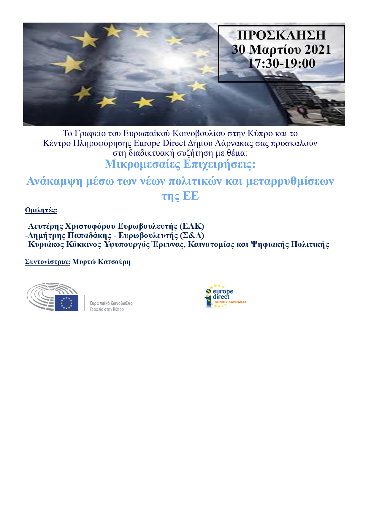Το Γραφείο του Ευρωπαϊκού Κοινοβουλίου στην Κύπρο και το Κέντρο Πληροφόρησης Europe Direct Δήμου Λάρνακας, διοργανώνουν τη διαδικτυακή συζήτηση με θέμα: “Μικρομεσαίες Επιχειρήσεις: Ανάκαμψη μέσω των νέων πολιτικών και μεταρρυθμίσεων της ΕΕ”.