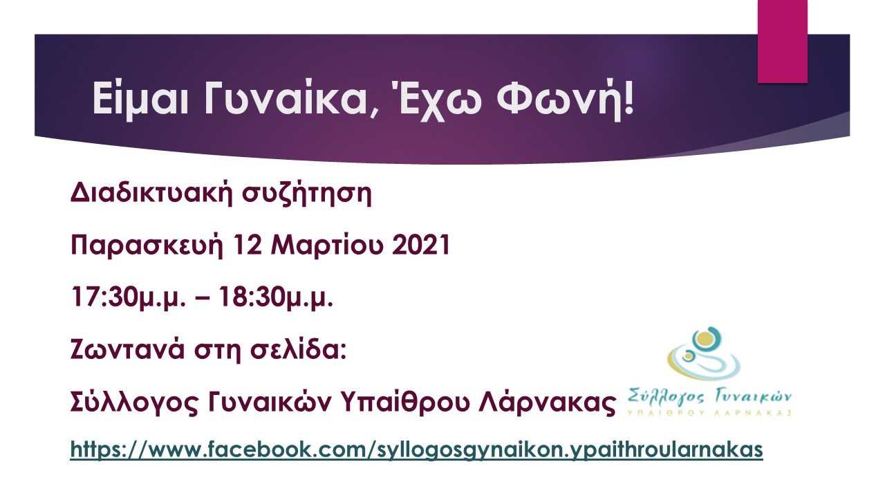Ο Σύλλογος Γυναικών Υπαίθρου Λάρνακας με την ευκαιρία της ημέρας της Γυναίκας που ήταν στις 8 Μαρτίου, διοργανώνει διαδικτυακή συζήτηση με τίτλο «Είμαι Γυναίκα, Έχω Φωνή». Σκοπός της συζήτησης είναι η ενημέρωση των γυναικών σε θέματα που αφορούν τη βία, τα δικαιώματα, τις πολιτικές για την ισότητα καθώς και τα μέσα που μπορούν να αξιοποιήσουν για να έχουν φωνή.