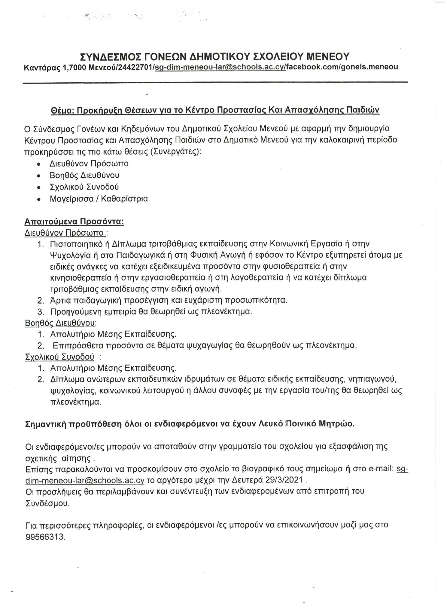 Ο Σύνδεσμος Γονέων του Δημοτικού Σχολείου Μενεού, ανακοινώνει ότι με αφορμή την δημιουργία Κέντρου Προστασίας και Απασχόλησης Παιδιών στο Δημοτικό Σχολείο Μενεού, για την καλοκαιρινή περίοδο, προκηρύσσει θέσεις για συνεργάτες.