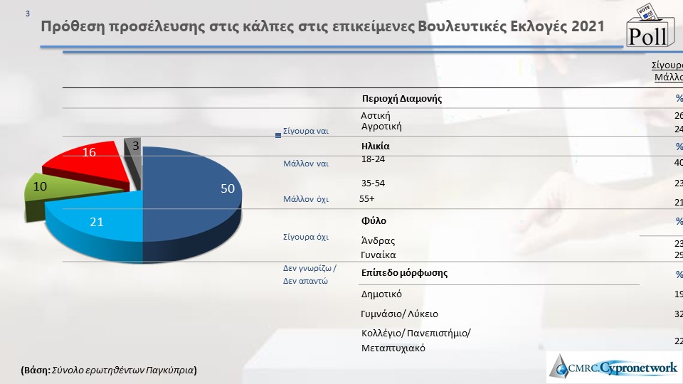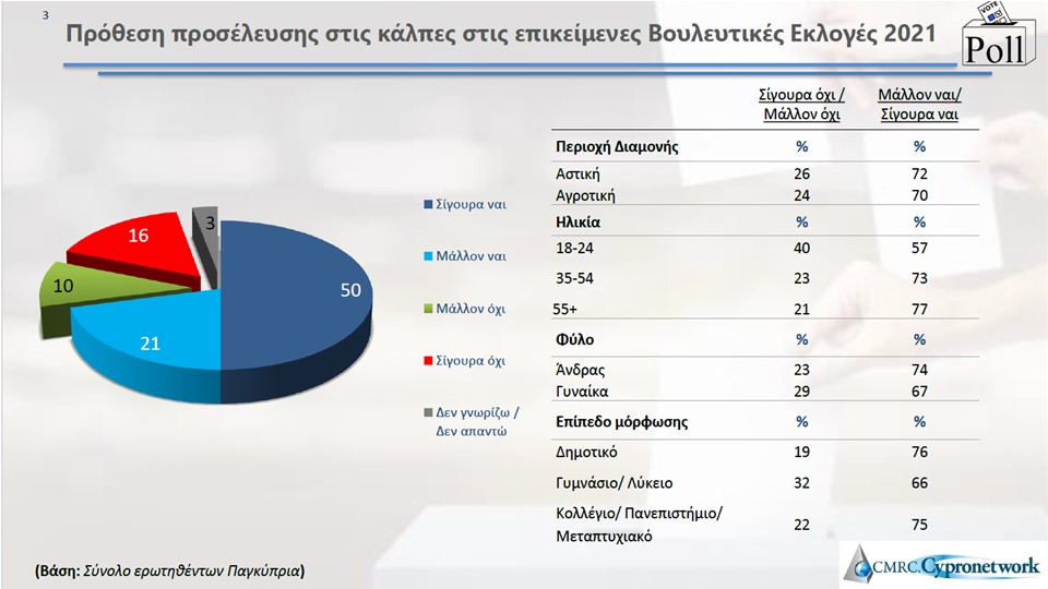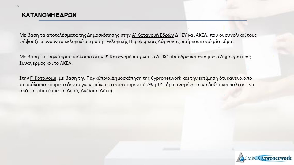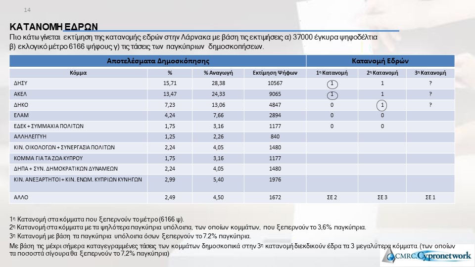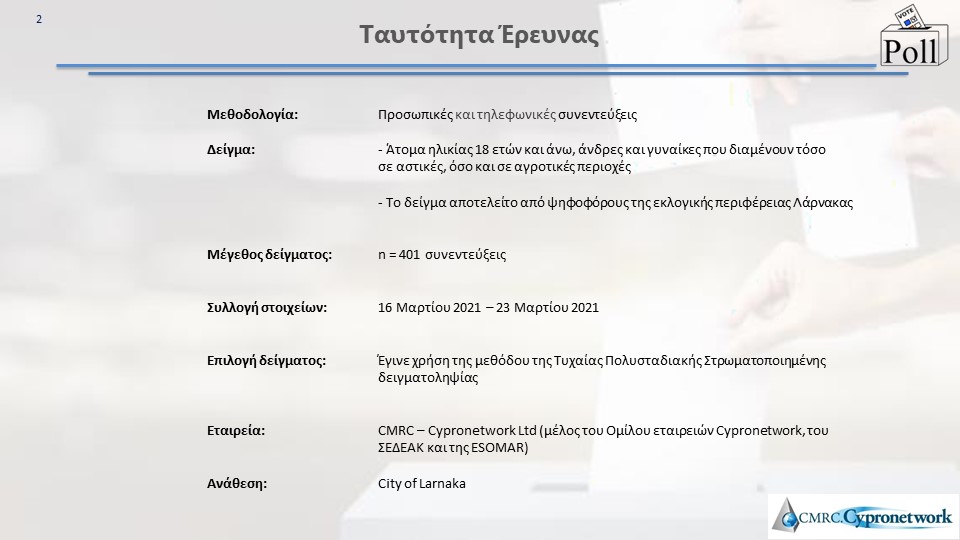 Η δημοσκόπηση έγινε από την εταιρεία CMRC. CYPRONETWORK και αποτελεί ανεξάρτητη έρευνα για την εκλογική περιφέρεια Λάρνακας.