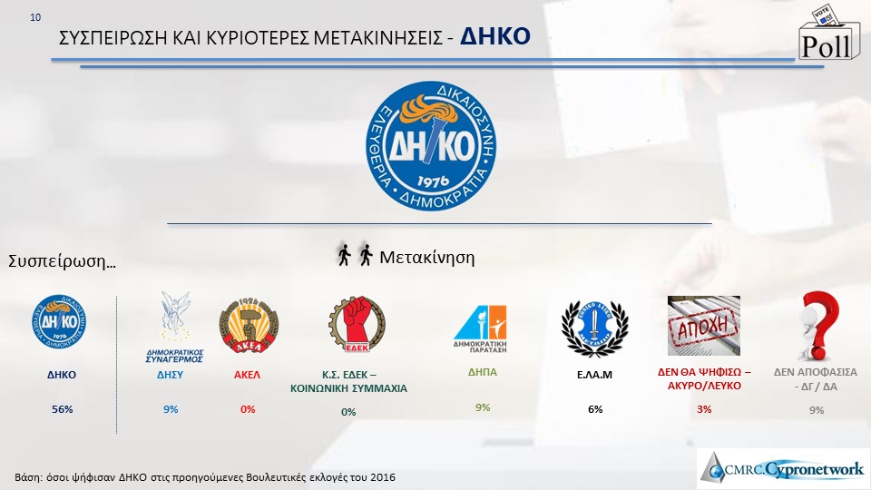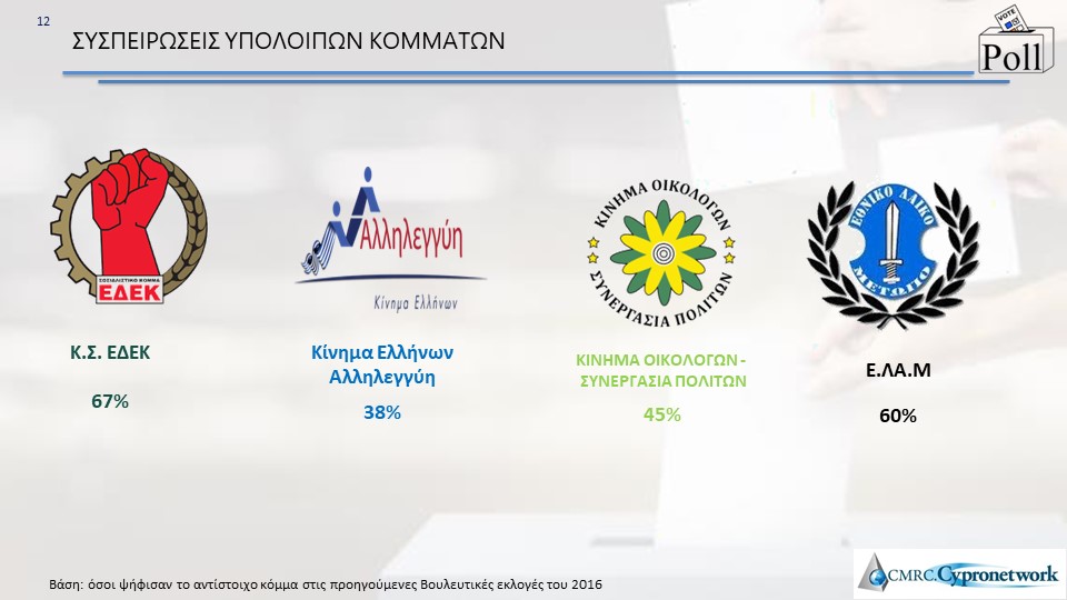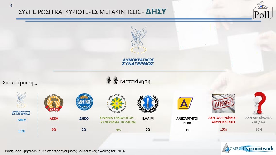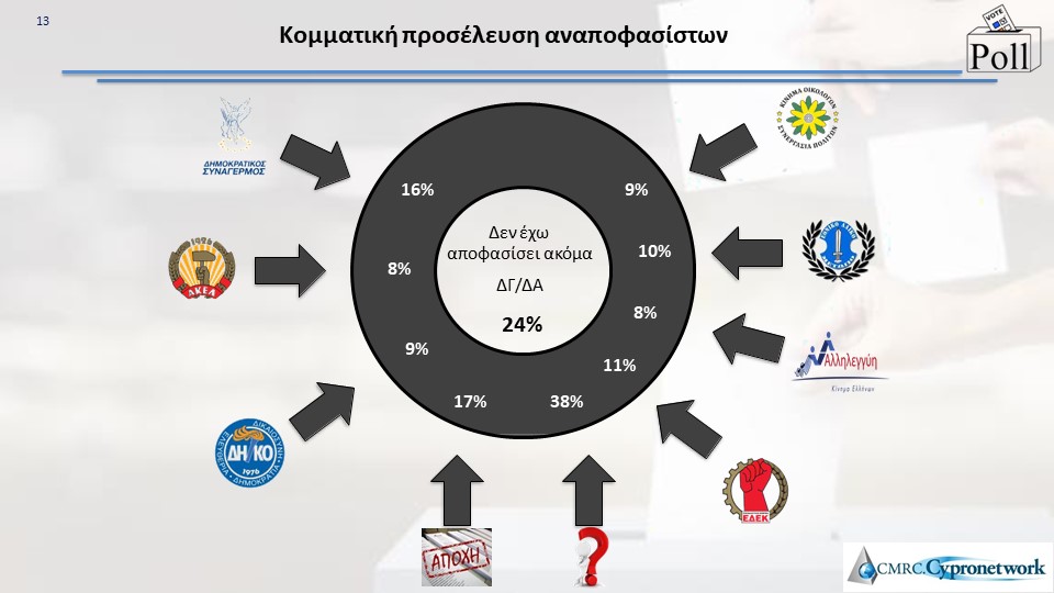 Από τα πολιτικά κόμματα, ο Δημοκρατικός Συναγερμός συγκεντρώνει το μεγαλύτερο ποσοστό αναποφάσιστων με ποσοστό που ανέρχεται στο 16% , ακολουθεί η ΕΔΕΚ με 11% και το ΕΛΑΜ με 10%.