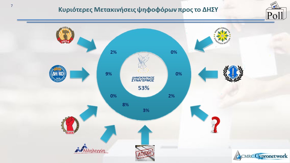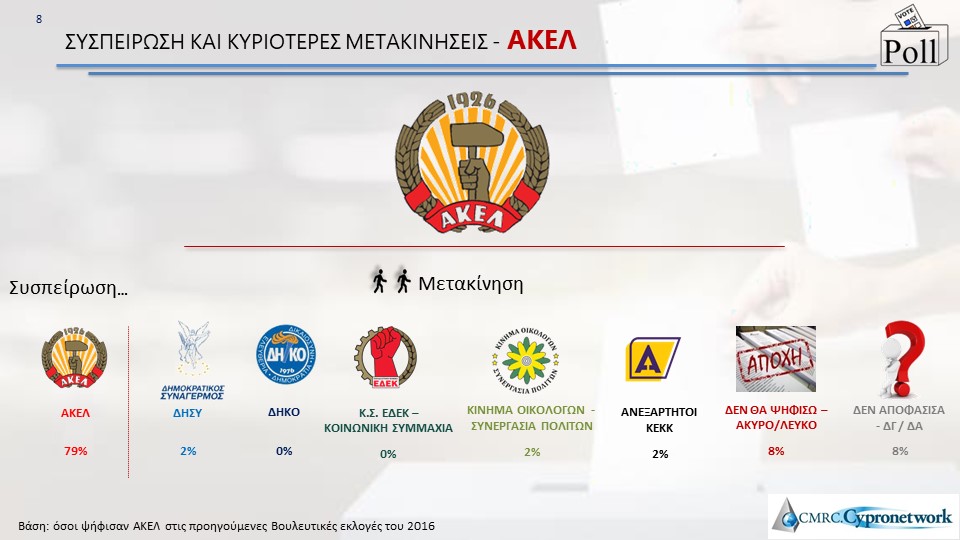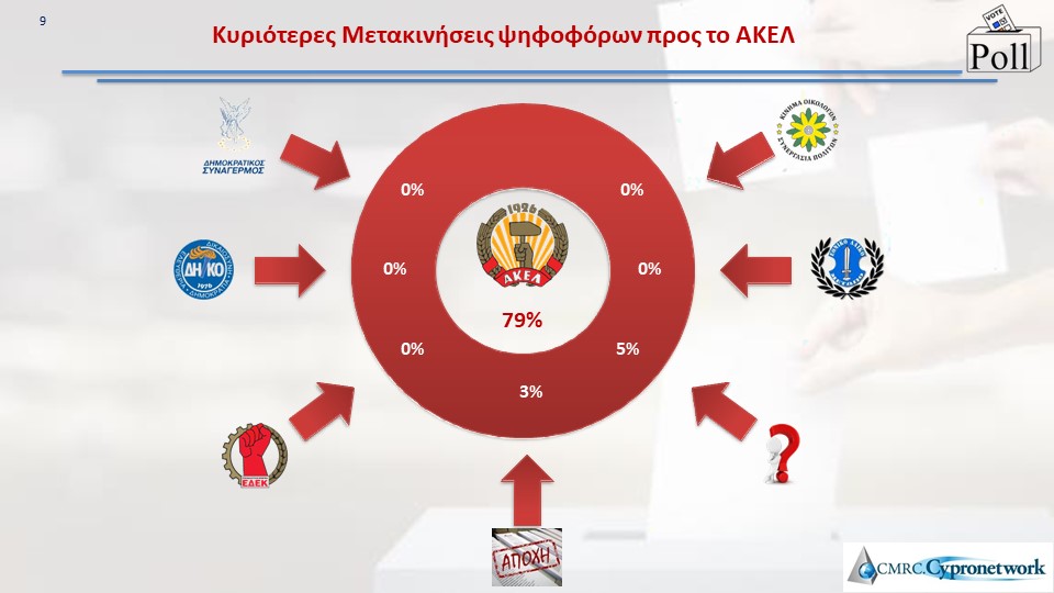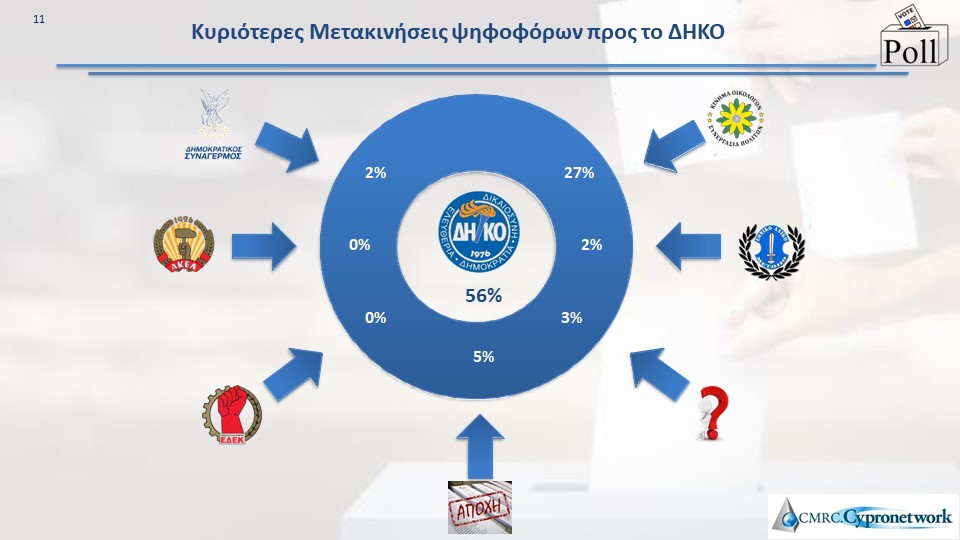 Αισθητή είναι η αύξηση μετακίνησης ψηφοφόρων από τον Δημοκρατικό Συναγερμό αλλά και το ΑΚΕΛ, με υψηλά για τα δεδομένα ποσοστά που διασκορπίζονται σε μικρότερα κόμματα, αλλά και στην αποχή όπως φαίνεται στις πιο κάτω κάρτες.