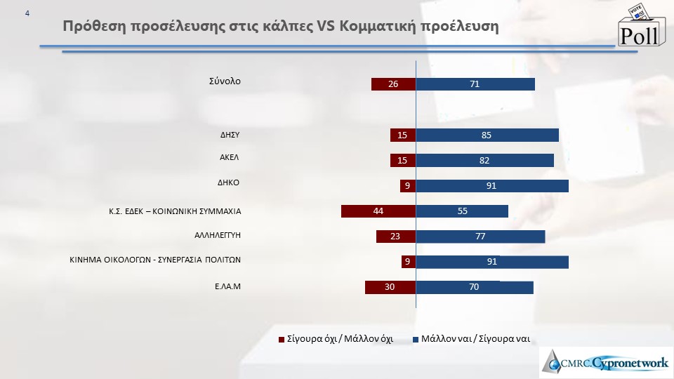 Πρόθεση για προσέλευση στις κάλπες έχει η πλειοψηφία των συμπολιτών μας, με γενικό ποσοστό της τάξης του 71%. Οι ψηφοφόροι του Δημοκρατικού Κόμματος και των Οικολόγων με 91% έχουν την πρώτη θέση ως προς την πρόθεση προσέλευσης των ψηφοφόρων τους στις κάλπες. Ακολουθεί ο Δημοκρατικός Συναγερμός και το ΑΚΕΛ, με ποσοστά 85% και 82% αντίστοιχα.