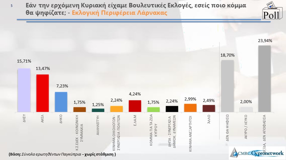 Στην ερώτηση αν την ερχόμενη Κυριακή είχαμε Βουλευτικές Εκλογές, εσείς ποιο κόμμα θα ψηφίζατε, το 23,94% των Πολίτων της Εκλογικής Περιφέρειας της Λάρνακας, απάντησαν πως δεν αποφάσισαν τι θα ψηφίσουν, ενώ το 18,7% υποστήριξε πως δε θα ψήφιζε.