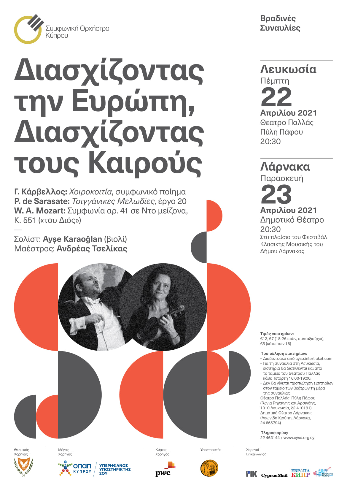 Η Συμφωνική Ορχήστρα Κύπρου πραγματοποιεί την Μουσική παράσταση ‘Διασχίζοντας την Ευρώπη, διασχίζοντας τους καιρούς”,   την Παρασκευή 23 Απριλίου στις 8:30 μ.μ. στο Δημοτικό Θέατρο Γ. Λυκούργος, στα πλαίσια του Φεστιβάλ Κλασικής Μουσικής.   Κύπρου.
