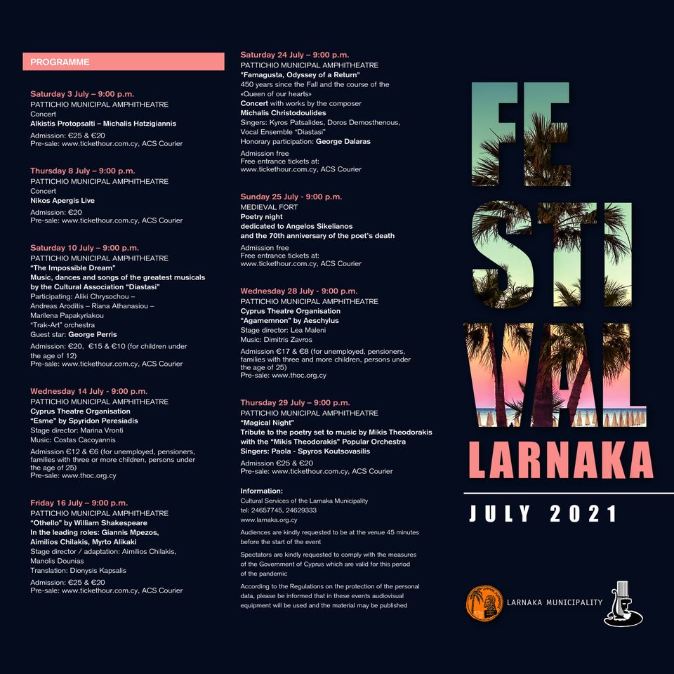 Αν και φέτος, όλα μοιάζουν να είναι διφορετικά, εντούτοις και φέτος ο Δήμος Λάρνακας έφτιαξε ένα πρόγραμμα με 9 εκδηλώσεις που θα παρασύρουν το κοινό στον παλμό της τέχνης του θεάτρου, της μουσικής και της ποίησης.