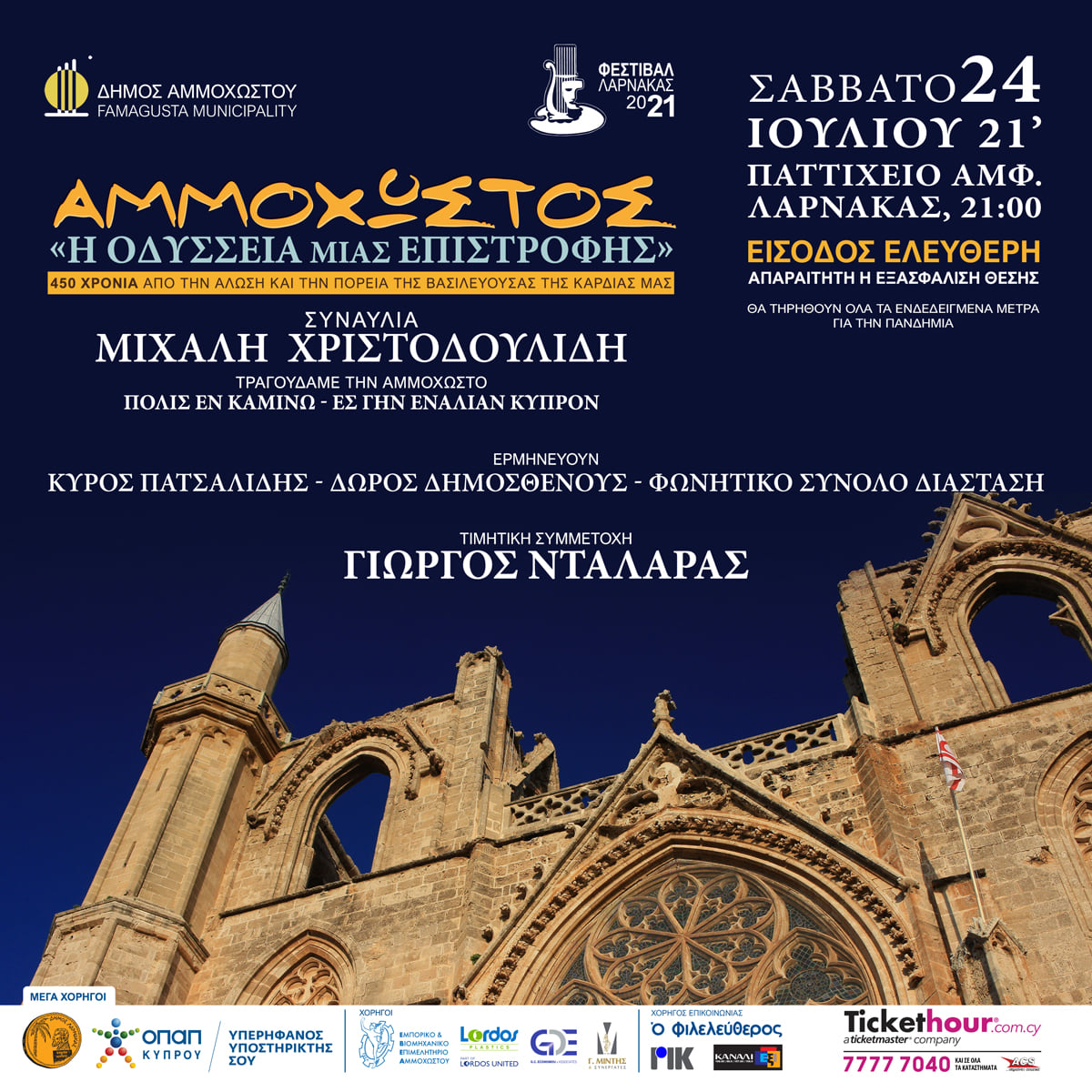 Το Σάββατο 24 Ιουλίου 2021 και ώρα 9:00 μ.μ. στο Παττίχειο Δημοτικό Αμφιθέατρο Λάρνακας, στα πλαίσια του Φεστιβάλ Λάρνακας, έχουμε την παράσταση «Αμμόχωστος, Οδύσσεια μιας επιστροφής», 450 χρόνια από την Άλωση και την πορεία της Βασιλεύουσας της καρδιάς μας.